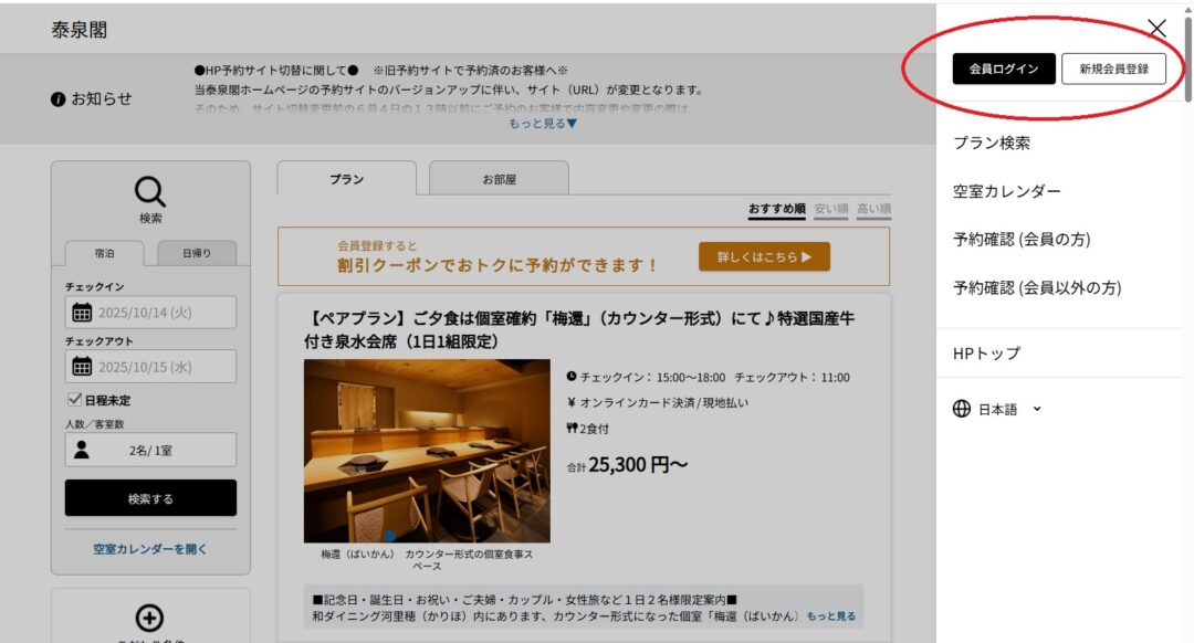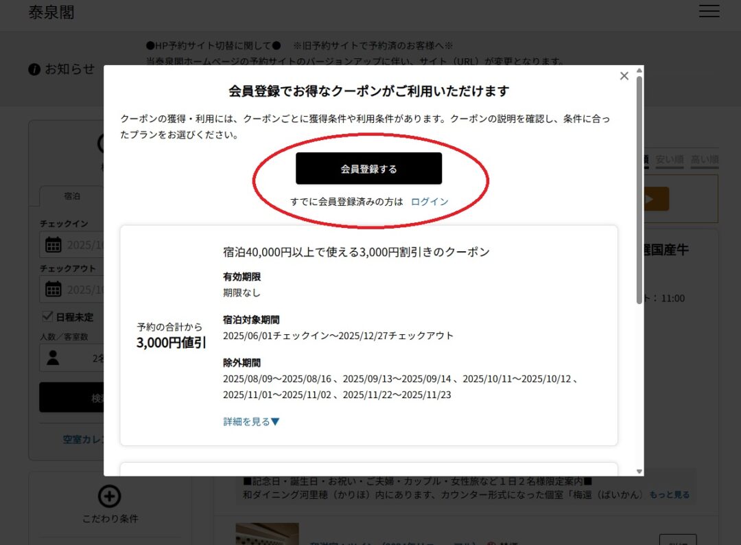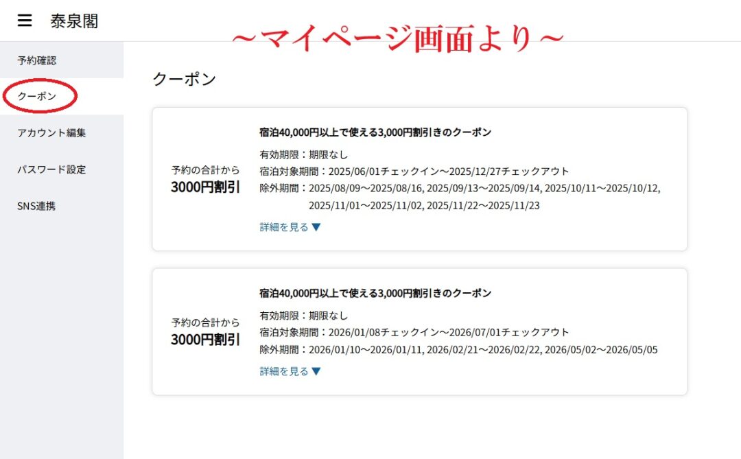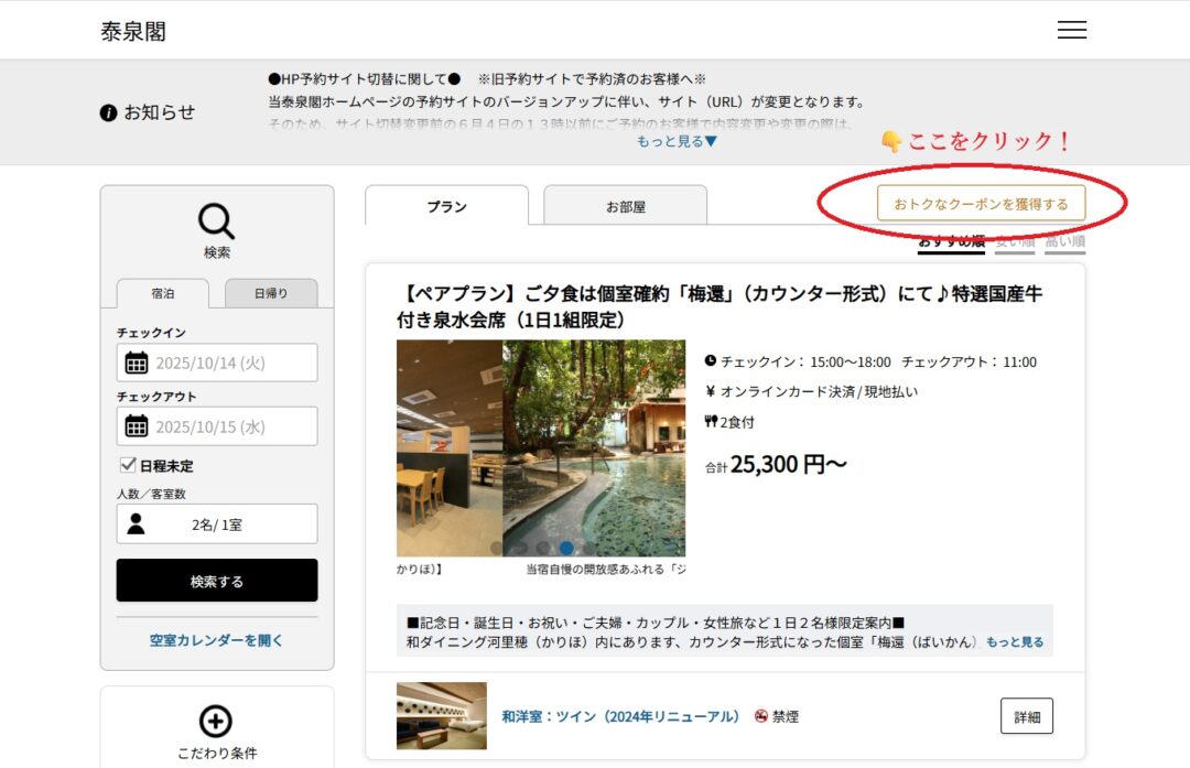 当泰泉閣ホームページ予約特典のうちの、割引クーポンの獲得方法のご案内です。