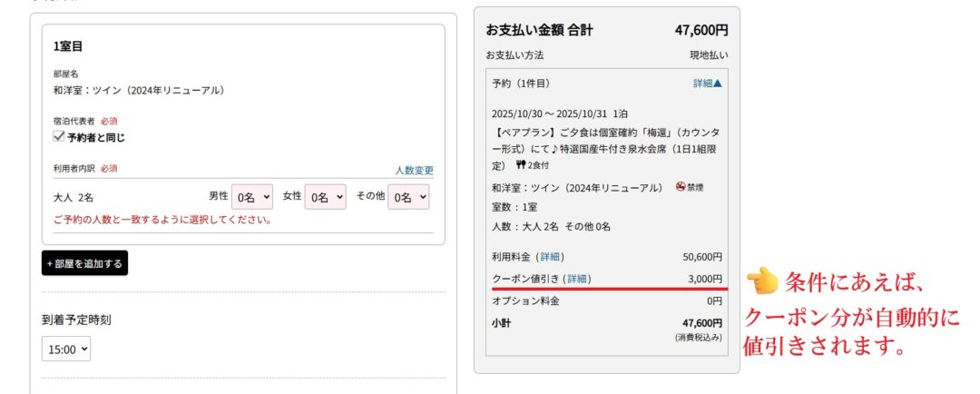 クーポンの獲得・利用にはクーポンごとに獲得条件や利用条件(金額や日にち、利用回数など)があります。クーポンの説明を確認し、条件に合ったプランやお日にちをお選びください。