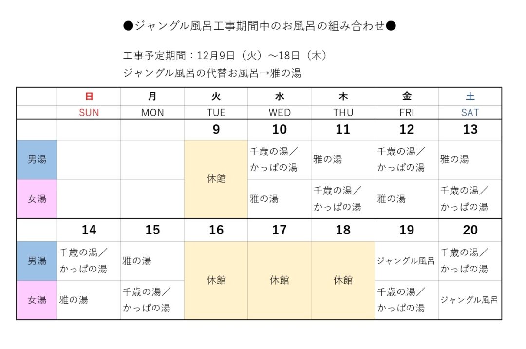 ジャングル風呂工事(閉鎖)期間:12月9日(火)~12月18日(木)の10日間