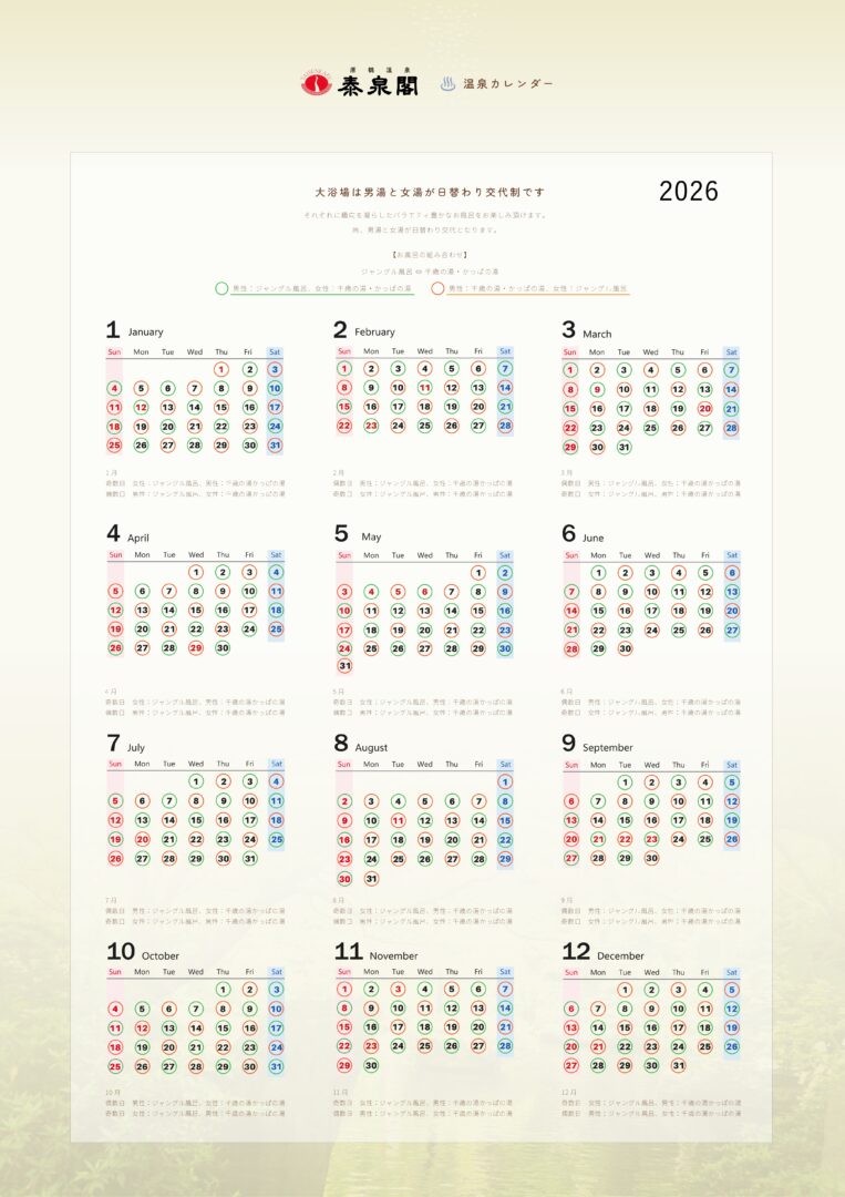 来年2026年のお風呂の男湯・女湯の組合せのご案内です!